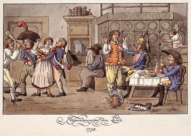 After being dismissed as a member of the Swiss Guard in The Hague, Hess returned to Zürich. A year later, in 1797, he married a woman named Anna Hirzel, who bore him two children. Unfortunately she died in 1802, after the birth of their second child. Hess remarried in 1805 with Salome Vischer. When France invaded Switzerland and established a Helvetic Republic in 1798, Hess' worst fears had come true. When subsequently, Napoleon Bonaparte annexed most of Europe into one empire, it turned into a nightmare. Hess found relief in creating caricatures and cartoons criticizing the Corsican general as well as the new government in his home city. Under the pseudonym David Hildebrant, he published a cartoon book under the title 'Der Scharringgelhof oder Regeln der guten Lebensart beym Abschiednehmen von der Stubenthüre bis zur Hausthüre und auf der Gasse' ("The Scharringgelhof or Rules of the Good Way of Life when Saying Goodbye from the Room's door to the Front Door and on the Street", 1801). Another caricature book, 'Politische Schaukel' ("Political Swing", 1802), was signed with "Gillray Junior".