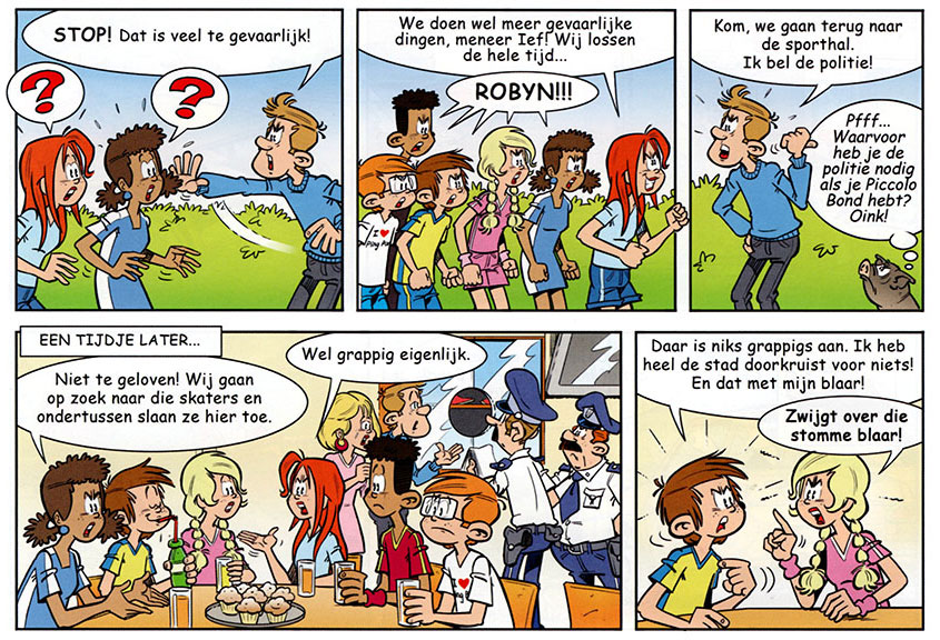 In 2018, Filip Heyninck teamed up with scriptwriter Nico De Braeckeleer to launch the comic series 'De S.P.O.R.T.S. Bende' for publisher Bakermat (an imprint of children's book publisher Baeckens Books). S.P.O.R.T.S. stands for Simon, Pablo, Olivia, Robyn, Timur and Shani, a diverse group of children who each practice a specific sport. Their adventures are set around the local sports club and snack bar of their hometown Kortevoorde, and involve jewelry thefts, alien invasions and ninja dance battles.