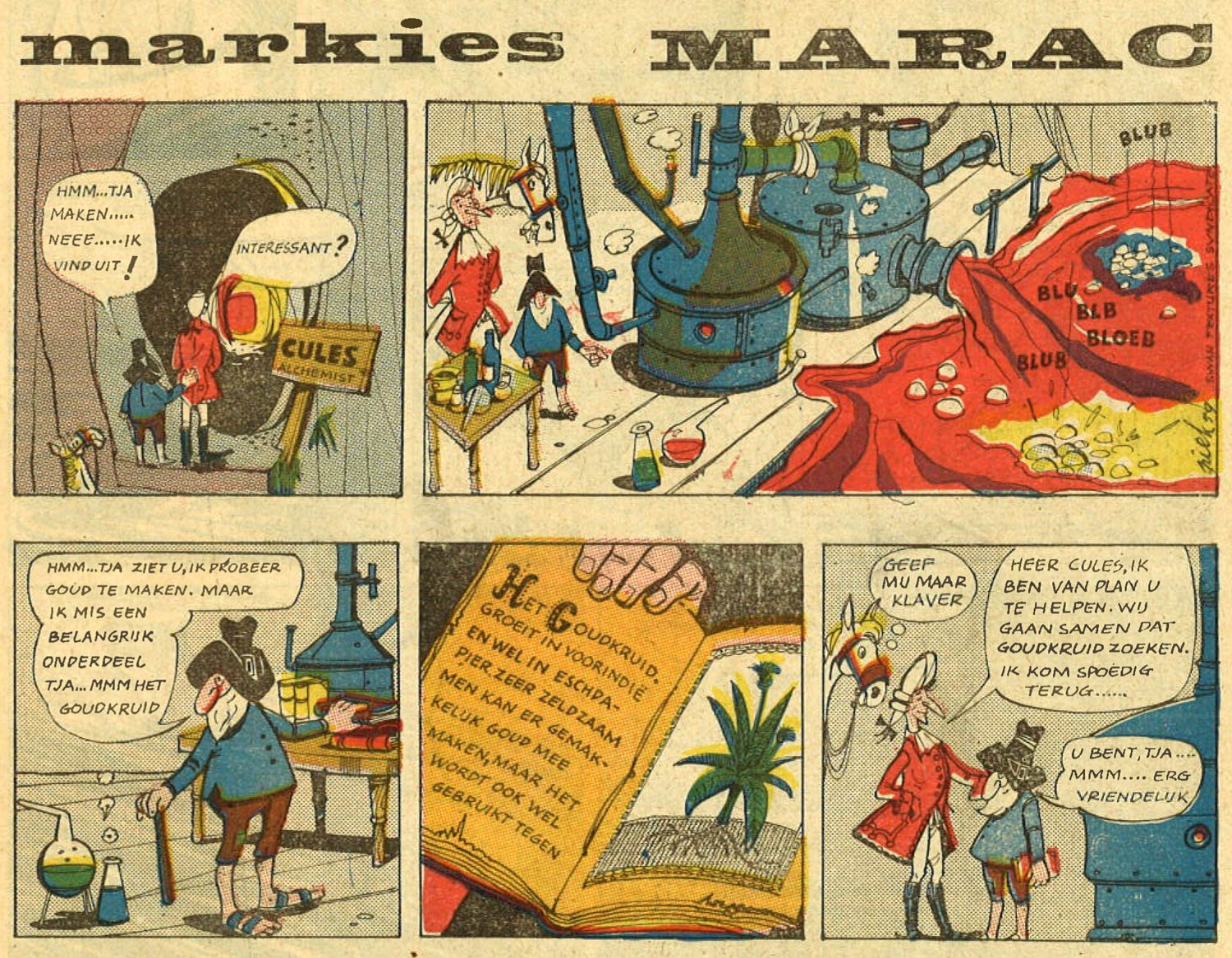 By the late 1950s, Hiemstra started working with Jacques Bouthoorn. One of their first assignments was the comic strip 'Markies Marac', distributed through Ton de Zwaan's Swan Features Syndicate to Olidin, the children's magazine of the Shell Junior Club. The comic is about a nobleman who heads for the Dutch Indies (nowadays Indonesia) with a prospector called Cules, in search of a substance with which they can make gold. Shell's promotional comic magazine ran the story in the first 19 issues of 1960. Most pages had the byline "Hiemstra & Bouthoorn", so the comic was apparently teamwork. However, some panels have the signature "Niek", which leads to believe that Hiemstra was the main illustrator. Other important contributors to Olidin were Emile BrumsteedeWim GiesbersFrits GodhelpFriso HenstraHans G. KresseJan KruisTed MathijsenJoost RietveldChris RoodbeenJan van der VooP. VisserDick VlottesCarol Voges, Joop Wiggers and Piet Wijn