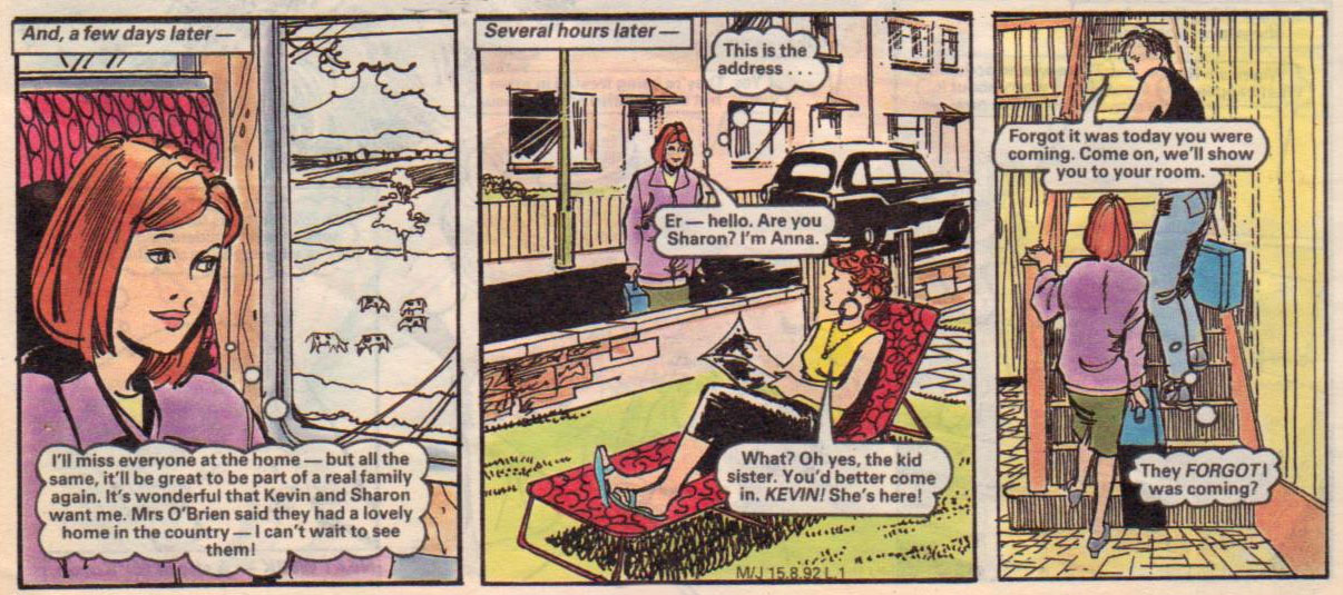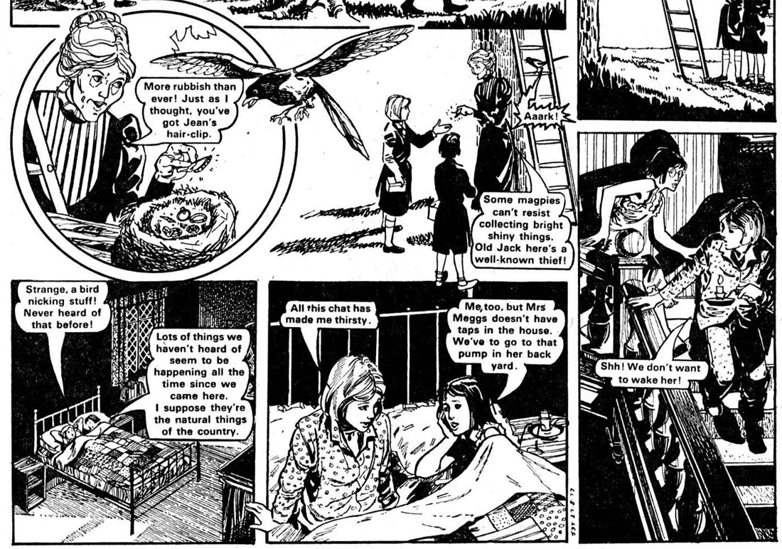 In 'Lonely Lotty' (Judy, 1982), 'Their Darling Daughter' (Princess, 1983) and 'Break-Up!' (Judy, 1989) innocent girls are victims of spiteful schemers who try to get rid of another girl by teasing her or bringing her in discredit. 'Hard Times for Helen' (Judy, 1984-1985) stars an unlucky girl who has to compete in popularity with her mother. Other stories deal with unsupported friendships, like in 'Don't Talk to Debbie' (Judy, 1987), or the many adventures one can have during a holiday job, such as 'Leave It to Lynne' (Bunty, 1990). Supernatural themes are present in Hill stories like 'The Witch's Brats' (Judy, 1977), 'The Fish Twins' (Judy, 1981), 'Marigold and the Three Bears' (Mandy, 1988) and 'Sally's Secret' (Mandy and Judy, 1993), while 'Search the World Over' (Judy, 1981) and 'Deadline for Cora' (Judy, 1983) were historically themed.