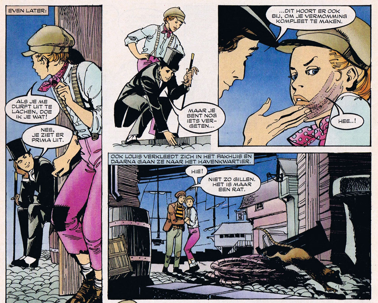 Many of Hill's colleagues at these magazines were Spanish studio artists affiliated with the London-based agency Creaciones Editoriales managed by Luis Llorente. Hill and several British scriptwriters were also represented by Creaciones for their international work, most notably for the Dutch girls' magazine Tina. While Tina reprinted much of Hill's British work, Hill also drew for the magazine directly. His most notable contribution was 'Louis en Louise' (1988-2000), an historical series by Patty Klein about two upper class children who flee from their stiff upbringing and have the wildest adventures. Hill additionally illustrated several independent short stories for Tina, as well as three stories with the ballerina 'Isabel' (1992-1993, named Nanette in English) with writer Norman Worker.