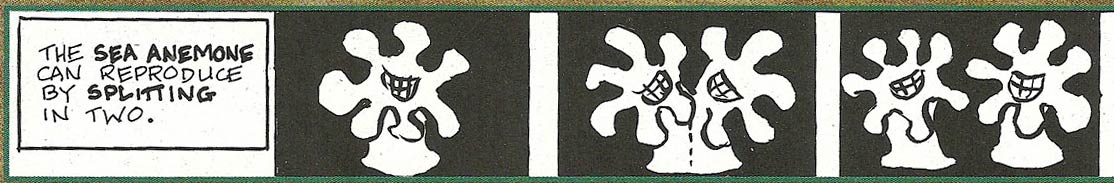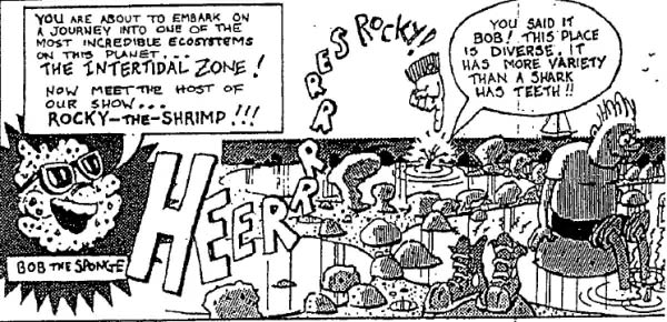 Between 1984 and 1987, Hillenburg taught marine biology. During this period, he drew an educational comic strip for his pupils. Titled 'The Intertidal Zone', it explains animal life in tidal and/or rock pools through the use of anthropomorphic sea creatures. One character was "Bob the Sponge", though he looked more like a naturalistic sea sponge at the time. Since Hillenburg's pupils loved the comic, he tried to bring it out as a comic book, but found no publisher interested. Decades later, a few images from this comic would be reprinted in the first issue of 'SpongeBob Comics' (2011).