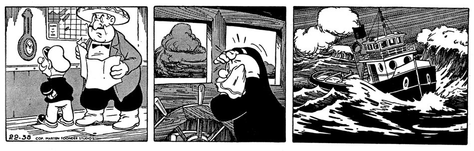 During his time at the studio, Hillenius worked on Toonder newspaper comics like 'Olle Kapoen', 'Panda' and 'Tom Poes', presumably only doing fill-in or assistant work. Between 1949 and 1957, he was the lead pencil artist of Toonder's newspaper adventure comic about tugboat captain 'Kappie', at the time written subsequently by Dirk Huizinga and then Lo Hartog van Banda. Hillenius' involvement lasted from the episode 'Kappie en de Zeewedstrijd' (story #21) through 'Kappie en de Geheime Schatkist' (#71). He was the third penciler on the feature after Mary Oosterdijk and Frits Godhelp. In 1957, Hillenius was succeeded by Ton Beek.