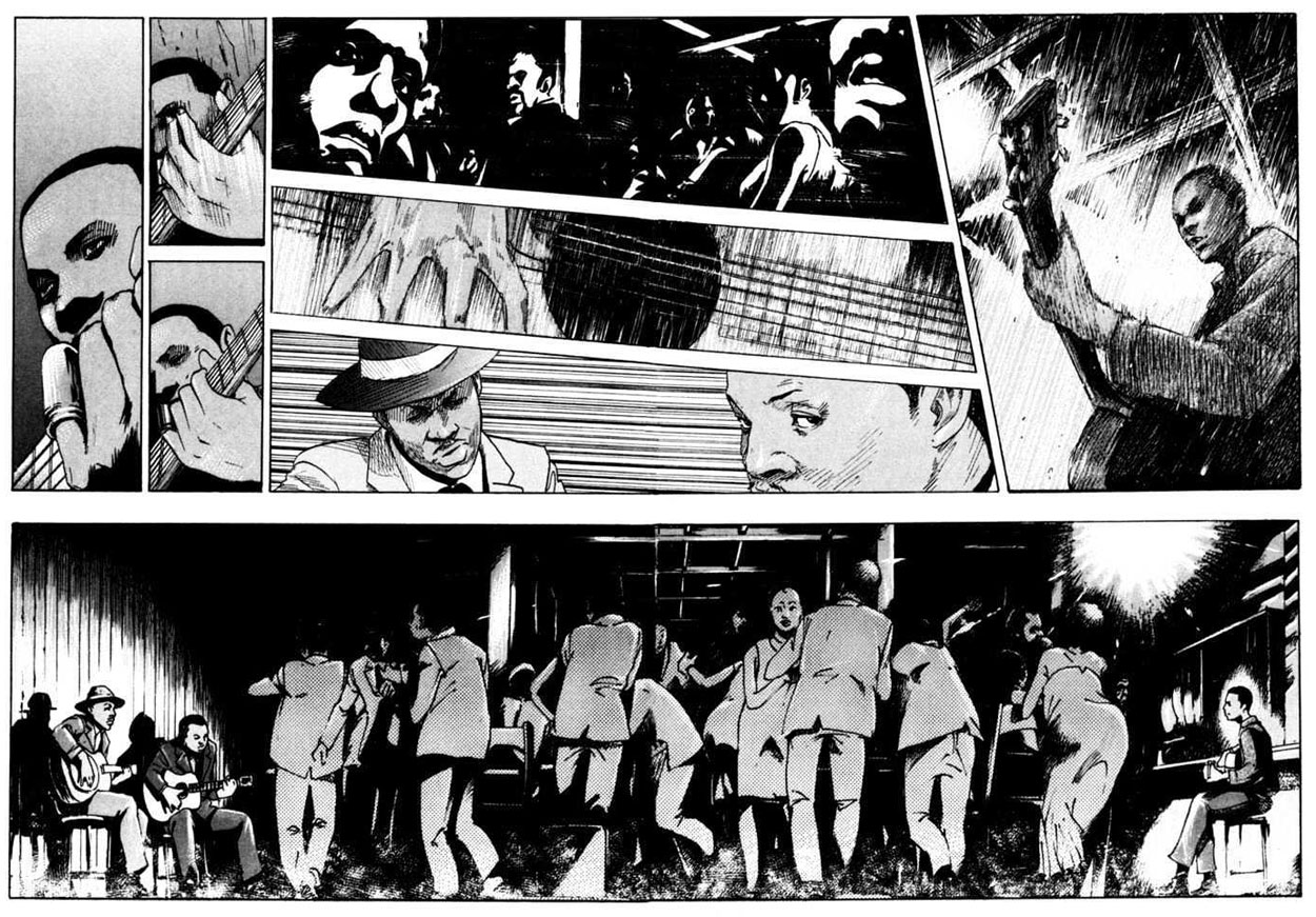 The comic is a strange mix between a distinctively American story - the life of an African-American singer in a racially segregated country - and the distinctively Japanese way of storytelling. Hiramoto delightfully surprised many Western readers by accurately evoking 1930s America in his drawings. Rather than be content with just focusing on Johnson's life as a musician he also draws attention to the racial segregation which was still in effect in those days. Various scenes are lifted directly from Johnson's real life story. Yet at one point Hiramoto deviates from the historical truth and follows more his own imagination. Some scenes still have a grain of plausibility over them, for instance when Johnson meets Clyde Barrow of the famous 1930s gangster couple Bonnie and Clyde. Others fall more into the fantastical, such as Johnson actually meeting the devil. From that point on the narrative becomes more creepy, wild and gory. Some people interested in a historically accurate depiction of Johnson's life might be put off by this gradual transformation into a horror fantasy. On the other hand, it is left ambiguous whether Johnson is just imagining all these horrific events as a result of losing his sanity.