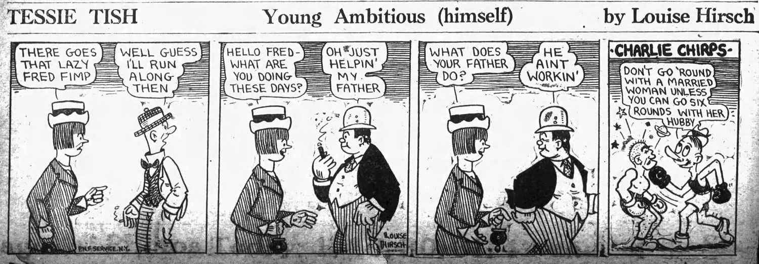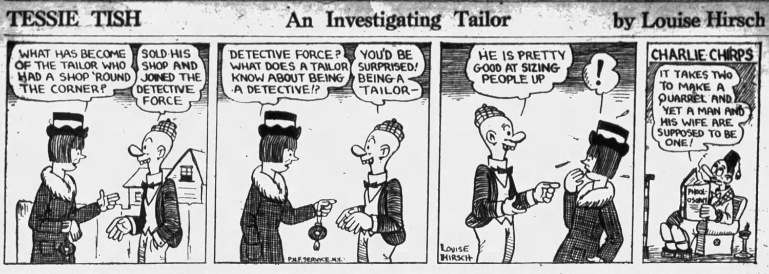 Louise Hirsch's weekly comic strip about the clever country girl 'Tessie Tish' was distributed to newspapers between at least October 1927 until 19 July 1928 through the New York-based Paramount Newspaper Feature Service (A.K.A.. PNF Service). Even though the gag-a-day strip appeared in the Sunday papers, it was presented in black-and-white dailies format. At the end of each strip, a non-related single panel was added featuring a wisecrack by a character called 'Charlie Chirps'.