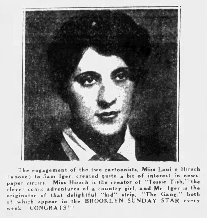 On 1 December 1927, the Brooklyn Sunday Star reported that their cartoonists Louise Hirsch and Sam Iger were engaged. Iger was also known as Jerry Iger, and would later run one of the first comic book production studios with his business partner Will Eisner. The couple got married in Brooklyn on 14 October 1928. The marriage didn't last. Will Eisner later remembered that Iger was embroiled in a divorce during the beginning of their collaboration. It kept him from investing in the new and uncertain enterprise. Considering Iger and Eisner's association began in 1936-1937, the couple probably broke up in that time period. No further whereabouts of Louise Hirsch are known.
