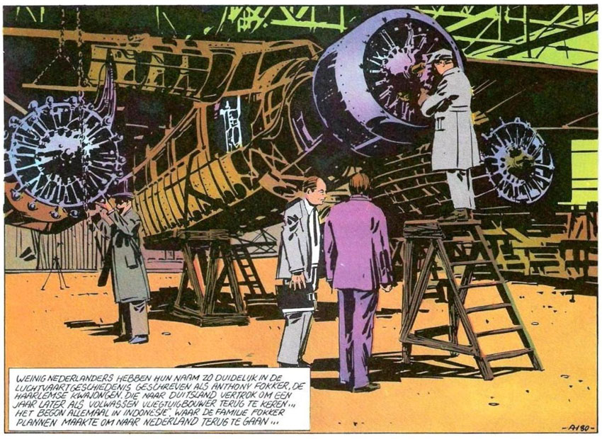 In 1982, Van der Hoeven returned to the medium of comics, when he drew a graphic biography of Anthony Fokker, the Dutch aviation pioneer and aircraft designer. Written by automotive journalist Derk Evers, the comic book 'Fokker - Gefluister Aan De Horizon' (Oberon, 1982) provided an accurate account of Fokker's life and career, making use of comic pages with both text captions and speech balloons.