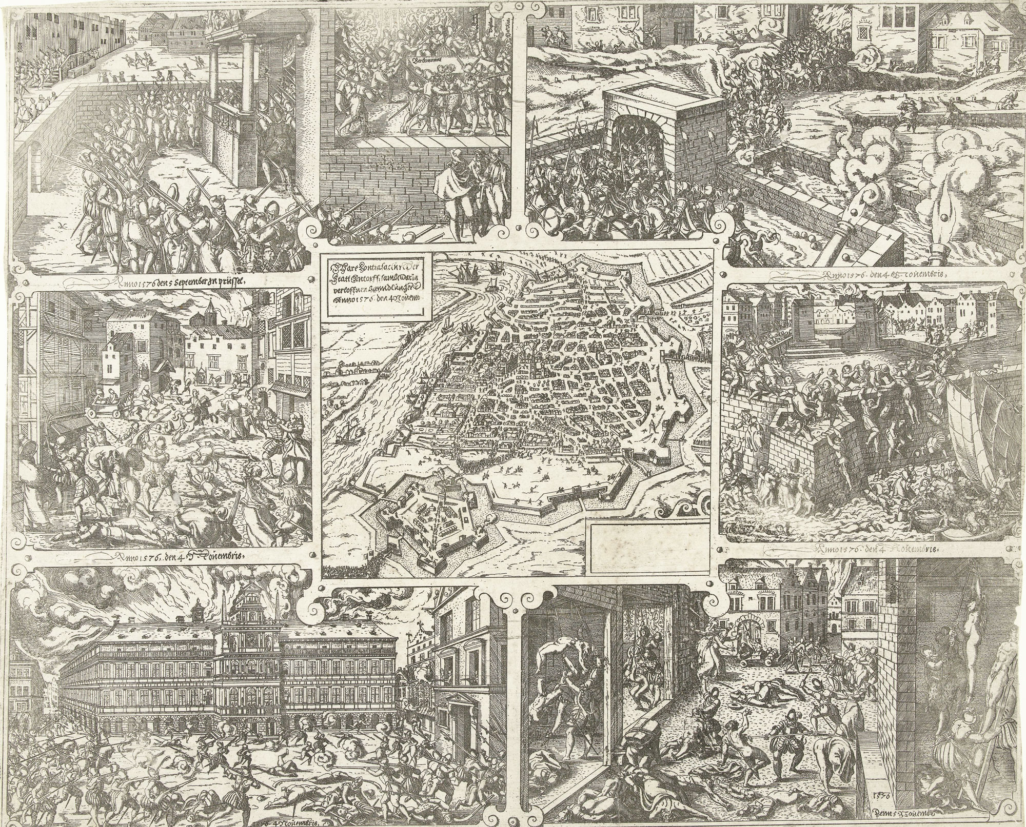 For more actual "picture stories", we have to look at some of Hogenberg's engravings about historical events. A particularly striking example is his visualization of the Spanish Fury (1576) in Antwerp. During the Eighty Years' War, the Spanish army fought against the Dutch resistance movement. After a decade, Spain was bankrupt and could no longer pay its soldiers. Mutiny broke out and in 1576, several cities in the Netherlands were plundered. Between 4 and 7 November of that year, the frustrated soldiers attacked Antwerp, a city rich thanks to its harbor. Four days long, troops plundered everything of value, raped women, tortured and killed citizens and set the town on fire. Thousands of people died during these atrocities, which sent a shockwave through Europe. Peace was declared on 8 November, during the Pacification of Ghent, which, in a scandalous move, granted all mutineers amnesty. But while peace returned, the Southern Netherlands were now severely weakened. Many people immigrated to the Northern Netherlands. In 1585, Antwerp was conquered by Spain, whereupon the Southern Netherlands became a Spanish province again.