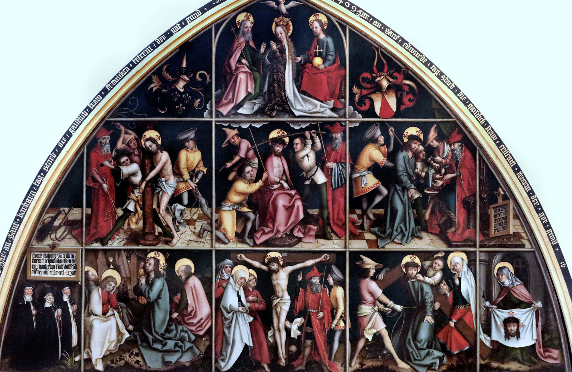 Holbein used Jesus' arrest and execution again in a comic strip narrative for the 'Epitaph der Schwestern Vetter' (1499), which can be admired in the Katharinenkirche (St. Catharine's Church) of Augsburg. Each scene is divided in consecutive panels. In the center, to be read from right to left, Jesus is selected for execution through a public referendum, organized by Roman governor Pontius Pilate, who afterwards literally and figuratively washes his hands in innocence. The story continues to the left, when Jesus is given the crown of thorns in a mock coronation. His humiliation continues in the next panel, when he is flogged. In the row below, again starting at the right, Jesus is forced to carry his own cross. Moving to the left, he is crucified and, in the final panel, seen praying before his rise to Heaven. Yet not all panels in this piece are a direct part of the story. Around the scenes with Jesus, Holbein depicts people and objects of symbolic importance, such as God, angels, nuns and – in the lower right - St. Veronica with the veil used to wipe sweat from Jesus' tired face during the Carrying of the Cross. According to Christian lore, Jesus' face was then reproduced on the cloth.