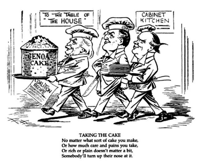 Cartoon depicting Lloyd George, Joseph Chamberlain and Winston Churchill (Reynolds News, 2 April 1922).