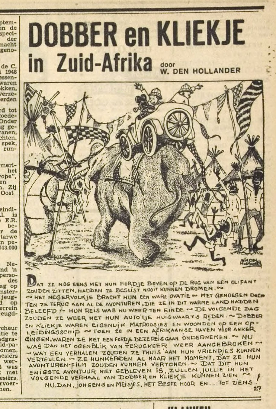 On a couple of occasions, Den Hollander tried his hand at comic stories. Between 22 May and 30 August 1948, the provincial newspaper De Zeeuwsche Courant serialized Den Hollander's children's picture story 'Dobber en Kliekje in Zuid-Afrika', about two explorers who travel through the African desert in their Ford car to make a film of the continent. Like most Dutch comics at the time, the feature was presented in the text comic format, with lengthy text captions appearing above and underneath the images. A second adventure of the characters, 'Dobber en Kliekje Op De Sleepvaart' was not serialized in a newspaper, but directly released as a 1949 comic book album by publishing company St. Gregoriushuis as part of its "learning to read" book series intended for elementary school children. However, St. Gregoriushuis was a Catholic company, run by firmly devout men. Since some of the African tribespeople in the book wore nothing but grass skirts, the publisher made Den Hollander redraw them with clothes. Later, when the publisher found out that Den Hollander wasn't Catholic, the artist's contract was instantly terminated. Nevertheless, 'Dobber en Kliekje Op De Sleepvaart' was reprinted nine times, with the last known edition rolling from the presses in 1965. The booklet may go down in history as the first Dutch comic used as an educational tool in schools.