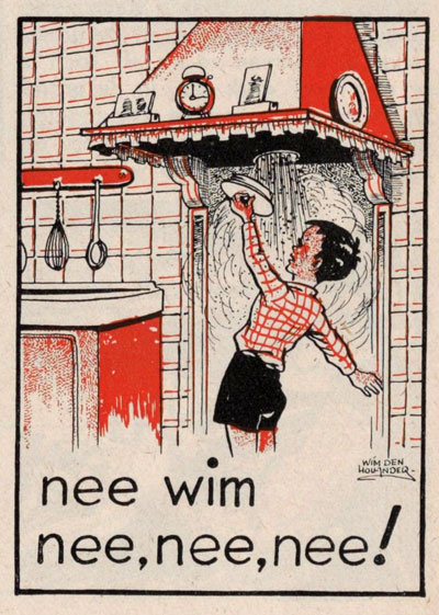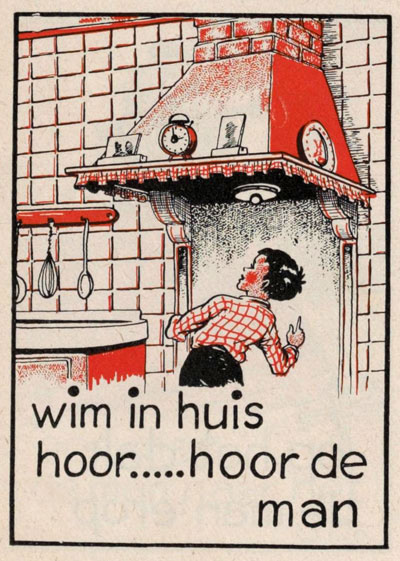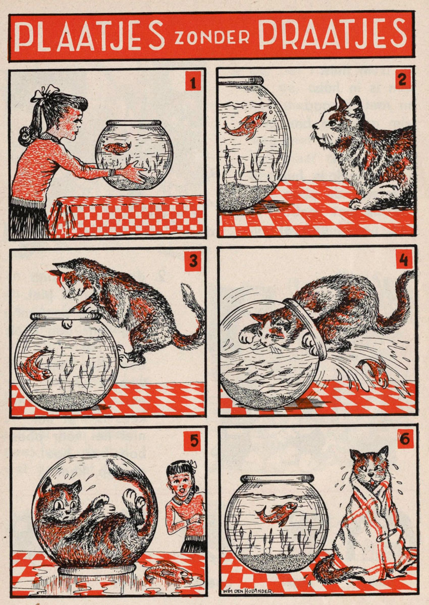 Interestingly enough, Den Hollander managed to do additional illustration jobs for other Catholic publishers. During the 1950s, he made illustrations and pantomime picture stories for De Engelbewaarder, a magazine circulating in Catholic schools. Between October 1954 and September 1955, he created the text comic serial 'Strik en Stropdas' for Taptoe, a Catholic children's magazine published by De Spaarnestad. This strip was created by Den Hollander under the credit byline "Jimmy Spake's Nonsens Strip Comp.". In 1956, he provided the illustrations for the book '40 Eeuwen Scheepvaart', written by Henri Arnoldus for N.V. Standaard Boekhandel.
