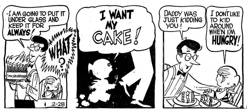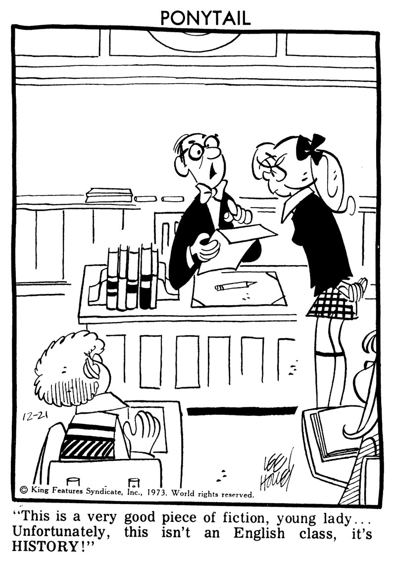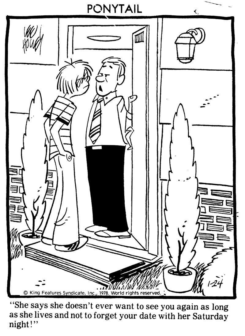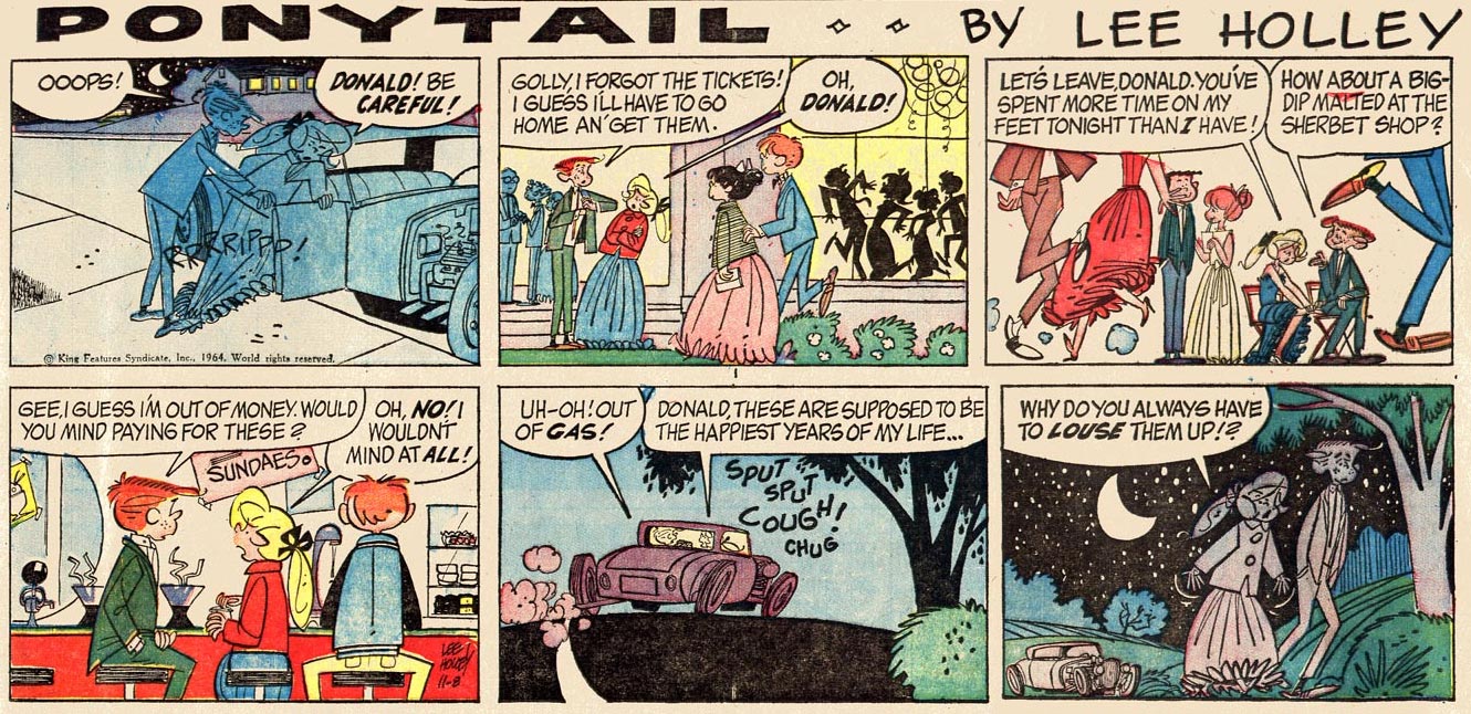 In addition, in August 1960 Holley sold his first 'Ponytail' cartoons to Teen Magazine. Holley gave up 'Dennis' when King Features Syndicate picked up his cartoon panel later that year, though Ketcham remained a prominent influence. On 7 November 1960, 'Ponytail' was launched as a daily cartoon panel and on 7 January 1962, a Sunday comic strip was added. The strip was firmly rooted in the new teenage culture with its high school life, drive-in cinemas, pop music, dating and generation conflicts, which had come to blossom in the 1950s. Ponytail Johnson is just like any other girl of her age, living in a suburban environment, trying to muddle her way through high school, nagging her old-fashioned father about an allowance raise, chatting away endlessly on the phone with her girlfriends and quarreling with her boyfriend Donald. Holley continued his strip until 16 October 1988.