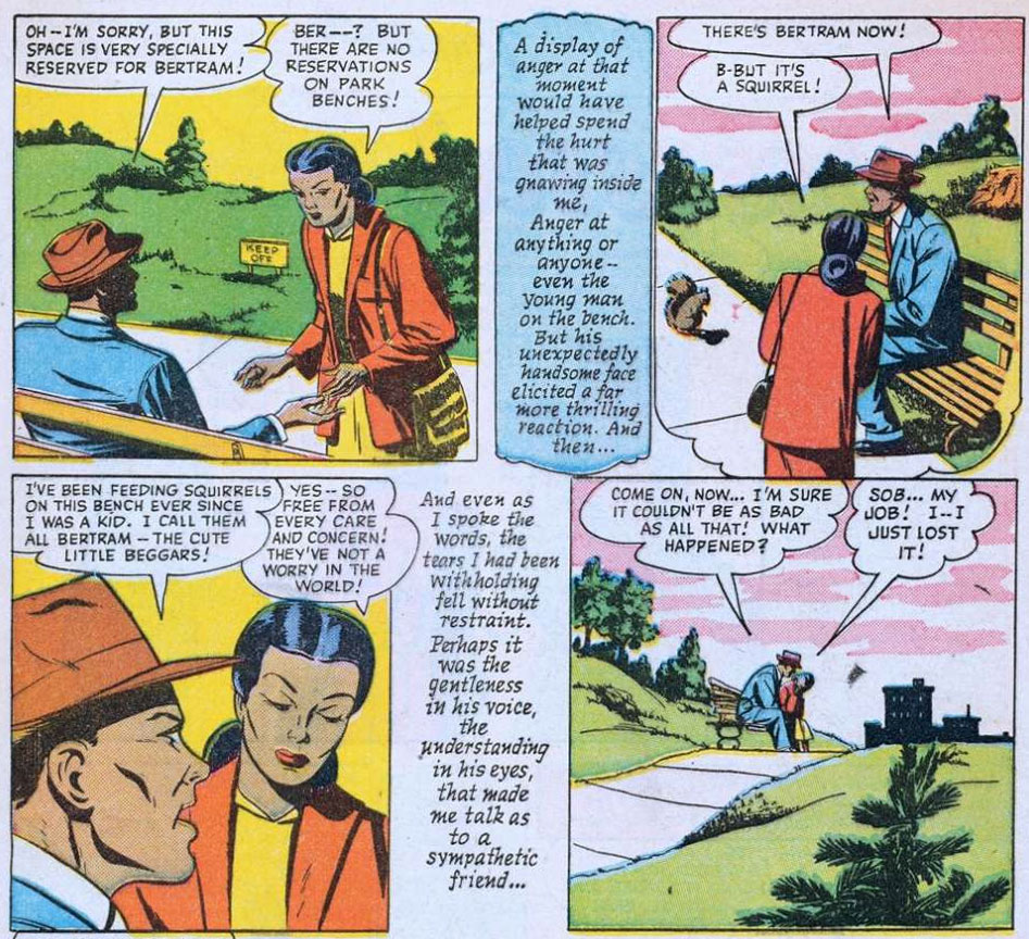 'Possessed' (Negro Romance #2, August 1950). The story is believed to be drawn by Alvin Hollingsworth. Negro Romance was a Fawcett comic book focusing on African-American romance stories, which remarkably enough for their time period avoided racial stereotypes.