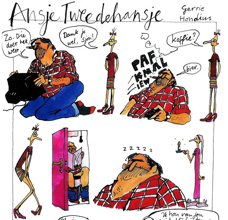 After making comics for the alternative and small press magazines Barwoel, and Levenslessen: Het Stripblad Voor de Mens, she published her first official comic, 'Ansje Tweedehansje', in the feminist glossy Opzij in 1996. In addition to 'Ansje', Hondius created new strips like weekly episodes of 'De Vriendinnen' (in Vriendin) and 'De Man in de Straat' (in NCRV-gids). Hondius has also made weekly illustrations for AD Magazine, and occasionally published comics in underground magazine Zone 5300, Algemeen Dagblad, Esta and nrc.next.