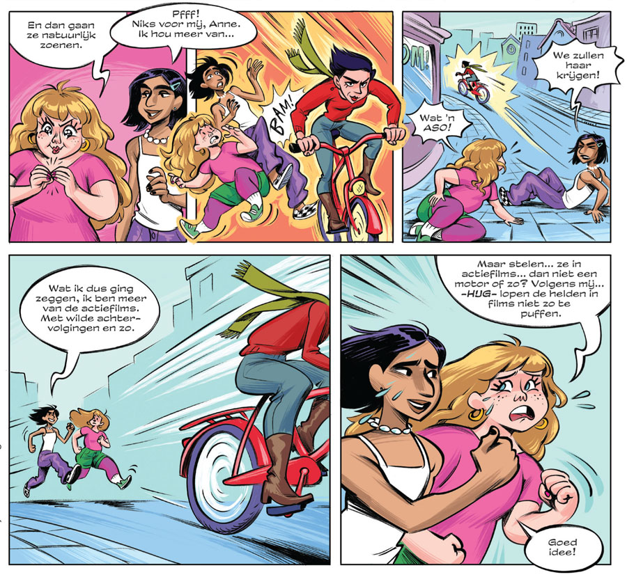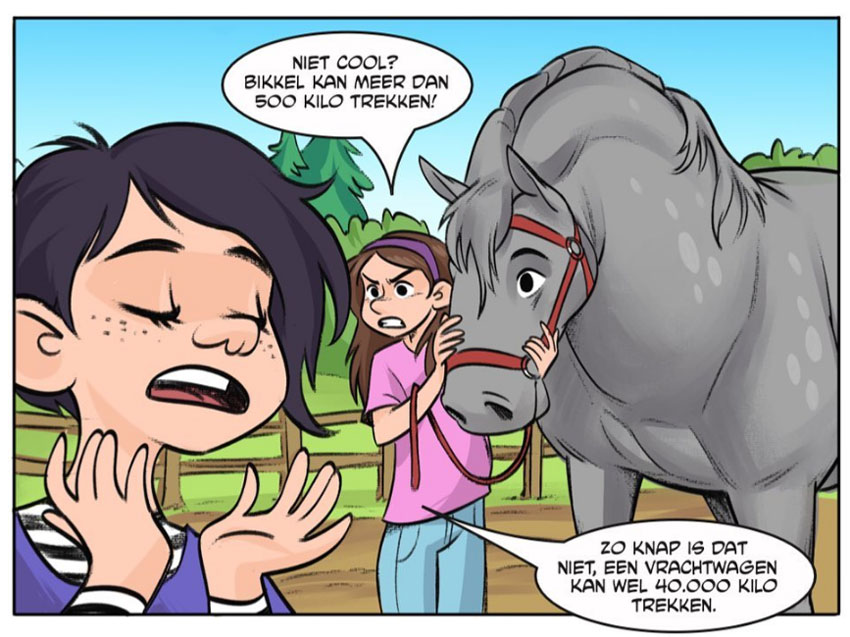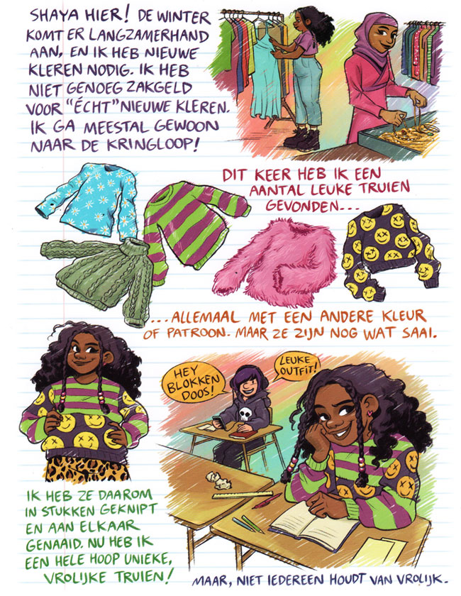 In addition to her topical comics, Nova de Hoo has also approached several children's magazines for girls with her projects. For Meiden Magazine, she created the back-page comic feature 'Shaya's Dagboek' (2022-2024), mixing a comic narrative with an illustrated diary format. With her dynamic and expressive artwork, Nova is also present in Penny magazine with 'Bibi en Bikkel' (2022- ), about a girl and her horse. In late 2023, she also began drawing one-shot comic stories for the girls' magazine Tina, both from her own scripts or by others (such as Betje Ton). In February 2025, her own comic feature 'Joy' debuted in Tina's pages. In her comic, De Hoo covers everything girls encounter in their young lives: from falling in love to exams and cycling vacations to their first bras. The character of Joy illustrates that things might feel a bit awkward, but are not terrible disasters either, offering a kind of reassurance to Tina's readers for everything that's yet to come.
