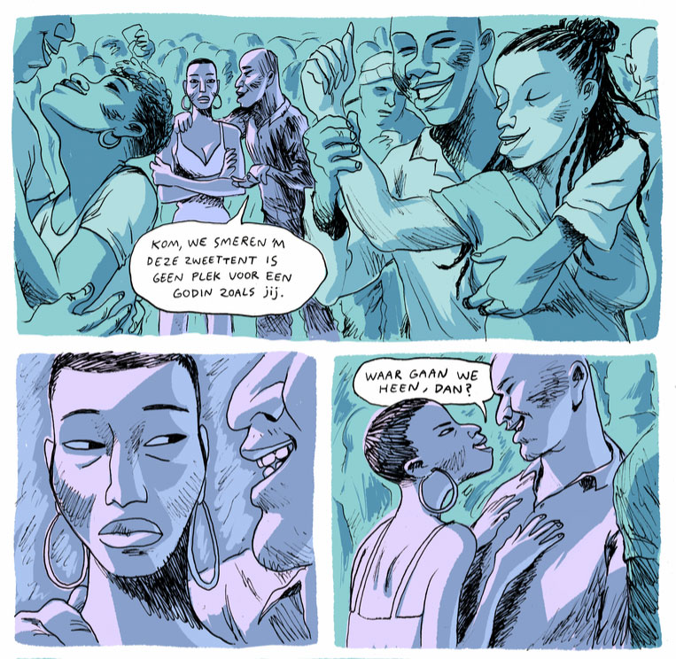 For her personal comic projects, Nova de Hoo tries to pick subjects that matter, usually connected to social issues, politics and feminism. Her 2023 graduation project, the 32-page self-published comic story 'Middag, Aand, Oggend', dealt with sex workers in South Africa. Through the Sex Workers Education and Advocacy Taskforce (SWEAT), she had Zoom calls with several experienced experts, resulting in the story of Akhona, a South African sex worker who is apprehended by a police officer after a night out. However, the arrest turns into a kidnapping, leaving Akhona at the mercy of feelings of fear and powerlessness.