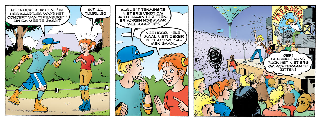 'Puck' (Tina #35, 2000). Translation: "Hey, Puck, look! I have two tickets for the concert of "Treasure"! Wanna come along with me?" - "Me? Yes, sure!" - "If you don't mind to sit in the rear. There were only two tickets left." - "No, not at all! Especially not if we go together..." - "Phew, luckily Puck didn't mind sitting in the rear."