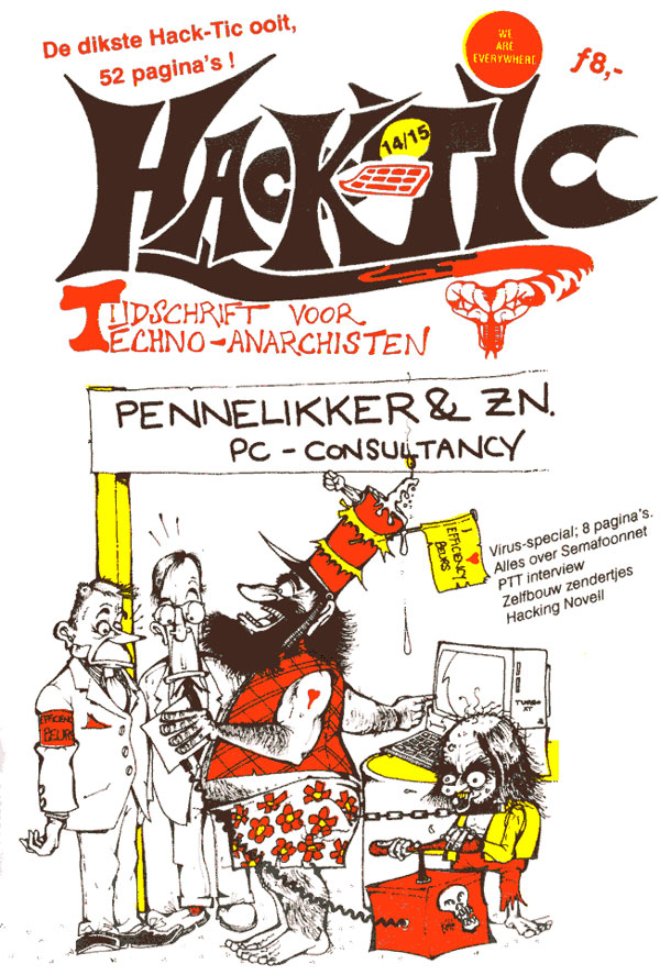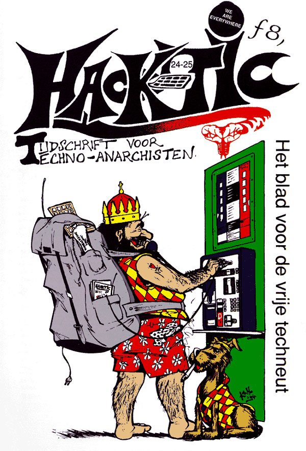One of Hottentot's early clients was Rob Gonggrijp's notorious hackers' monthly Hack-Tic, for which he made all the covers and interior illustrations during its existence from 1989 to 1994. Hack-Tic labeled itself as the first magazine for "techno-anarchists", and informed the upcoming hackers' community about blunders and weaknesses in computer systems during the early years of the internet. Hottentot's involvement was solely as illustrator, claiming he himself had no knowledge of computers whatsoever. His most notable contribution was designing Hack-Tic's mascot, a wildly bearded savage dressed in a boxer short with floral pattern, checked jacket and boots, who appeared on all the magazine covers. Hottentot also provided caricatures, for instance of Soviet leader Mikhail Gorbachev and Arthur Docters van Leeuwen, the head of the Dutch Homeland security. In 1993, the people behind Hack-Tic were responsible for the first public internet service in the Netherlands: XS4ALL.