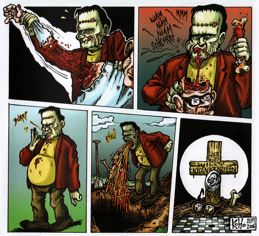 Hottentot didn't return to the comic medium until ten years later, when his comic 'De Avonturen van M.C.J. Pietersen: De Verkiezingskast' (2006) appeared online. The story was a protest against unreliable electronic voting machines, made by commission of his old friend Rob Gonggrijp and published on the website www.wijvertrouwenstemcomputersniet.nl. Hottentot also made new comic pages for the magazines published by René Dorenbos of Edollandia, including Sfeerie and MYX. He also contributed to Menno Kooistra's horror anthology 'Bloeddorst' (BeeDee, 2007) and in the same year, his 'Schnuurt' book was updated and re-released in color as 'Schnuurt Remastered' (Edollandia, 2007). The remaining pages of Hottentot's short stints in comics were compiled in 'Schnuurt - Epiloog' (2010), published by Peter Bonte. This marked the end (so far) of Koen Hottentot's career as comic creator.