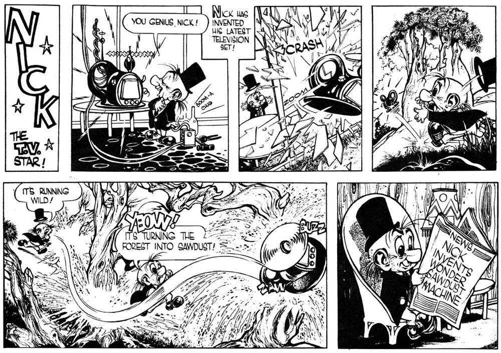 By the turn of the decade, Hutchings was the main artist of the cover feature 'Sooty' (1960-1961), based on the TV puppet show created by Harry Corbett, whose previous comics adventures appeared in TV Comic, drawn by Tony Hart.