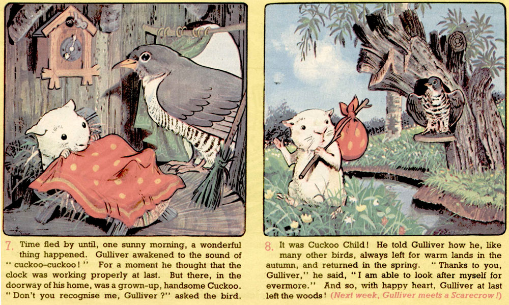 In Jack and Jill, children could enjoy Hutchings' comic strips 'The Merry Adventures of Pixie Pip' (1958-1961) and 'Tiny Tales of Gregory Grasshopper' (1958-1960), alongside occasional fill-in work of 'Freddie Frog', a character created by Peter Woolcock. He additionally served as the colorist for Hugh McNeill's 'The Fun and Frolics of Harold Hare' (1960), which also appeared in Jack and Jill. From 1959 on, Hutchings was present in Harold Hare's Own Paper, a preschool magazine named after McNeill's creation, published by IPC. Hutchings contributed 'Dagwood Duck' and 'The Little Horses'.