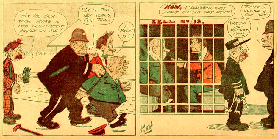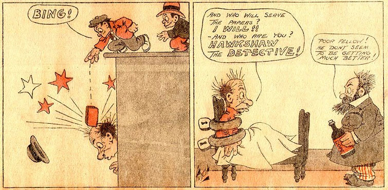 In the Chicago Tribune, Hutchinson published 'Willie Hawkshaw, the Amateur Detective', which ran between 27 August 1905 and 29 April 1906. The name 'Hawkshaw the Detective' was borrowed from a character in Tom Taylor's theatrical play 'The Ticket-of-Leave Man' (1863), though much of Hutchinson's character was modeled after Arthur Conan Doyle's 'Sherlock Holmes'. Interestingly enough, Gus Mager later had a comic strip named 'Hawkshaw the Detective' (1913-1947).