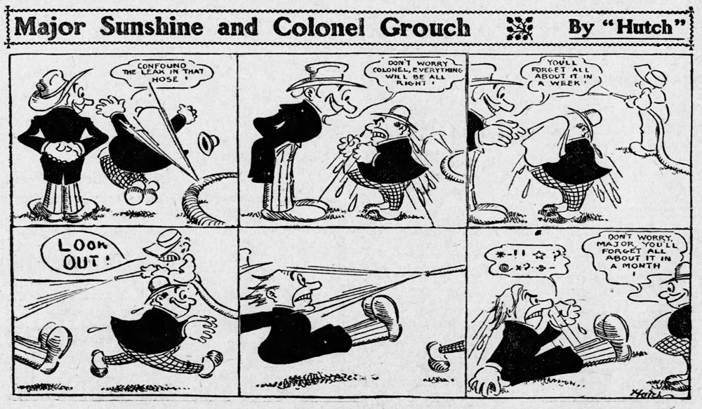 Hutchison's career opportunities expanded when he headed for New York City around 1910. His work appeared regularly in Joseph Pulitzer's The New York World. The paper's syndicate distributed his weekday comic strips 'Major Sunshine and Colonel Grouch' and 'Mrs. Economy' to other newspapers as well. 'Major Sunshine and Colonel Grouch' (28 July - 1 August 1911) stars a tall, optimistic man, Major Sunshine, and a shorter, more frustrated sidekick, Colonel Grouch. Their contrasting personalities form the basis of each gag, only to have the situation be reversed for the punchline, when Sunshine is unlucky and irritated, giving Grouch a reason to laugh. The comic only ran for a few days, presumably because the gimmick got old very fast. Hutchinson's other strip, 'Mrs. Economy' (31 October 1911 - 9 January 1912), starred a strong willed woman who tries to involve her less strong willed husband in her savings plans. When push comes to shove, she is not that consistent herself either, though.