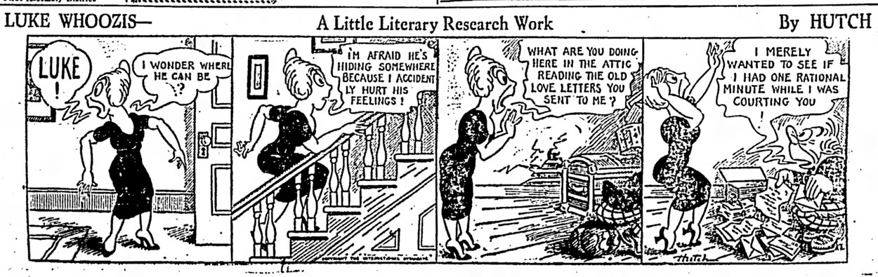 Hutchison briefly returned to comics with the daily strip 'Luke Whoozis', yet another comic hero stuck in a less affectionate marriage. It was syndicated through the International Syndicate between 7 August and 24 October 1923 to newspapers like the New Rochelle Standard-Star.