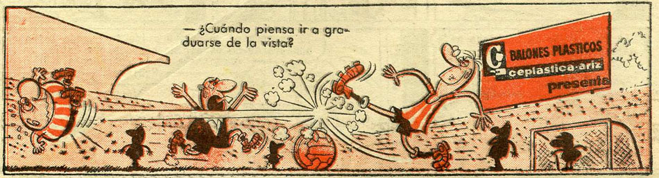 In addition to his own features, Ibáñez made a couple of remarkable advertising comic strips, combining the Bruguera humor style with commercial messages. Regularly, the publisher inserted advertisements in comics with their familiar characters, but sometimes new features were made specifically for this purpose. Bruguera even opened a special advertising division to manage these productions, Nueva Línea. In 1962, both Ibáñez and Manuel Vázquez made advertising strips for Nogueroles chocolate with the character 'Kitín, el Amigo de los Niños', appearing in Pulgarcito, El DDT and Tío Vivo. For the latter, Ibàñez created several soccer soccer cartoons for the advertising strip 'Balín y Balón' (1962-1963). In the billboards surrounding the soccer field, sponsored by ball manufacturer Ceplástica-Áriz. For a period of two years, Ibáñez promoted the German UHU glue in several Bruguera magazines with his comic strip 'Uhu y el Niño Prudencio' (1964-1966), starring an owl (Uhu) who causes problems with a tube of glue. The production of the Nueva Línea advertising strips was a big annoyance to Bruguera's editorial director Rafael González, who saw the delivery of his regular comic features delayed by them. So by 1966, Ibáñez was replaced on the 'Uhu' feature by Juan Martínez Osete and Miguel Bernet Toledano.