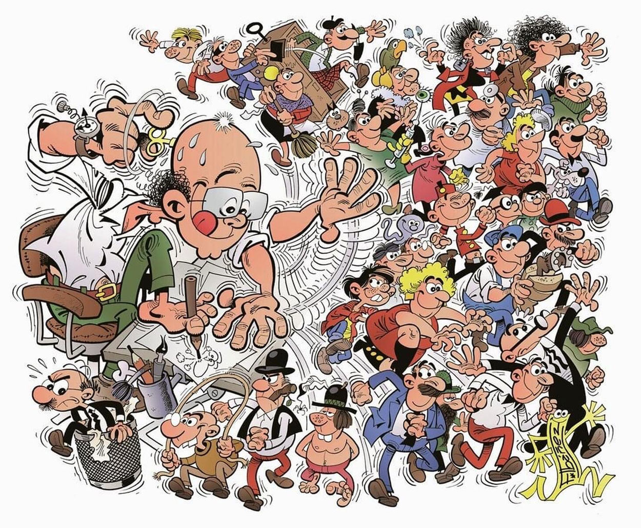Francisco Ibáñez and his characters, including the living signature (bottom right) that he began using in the 1990s.