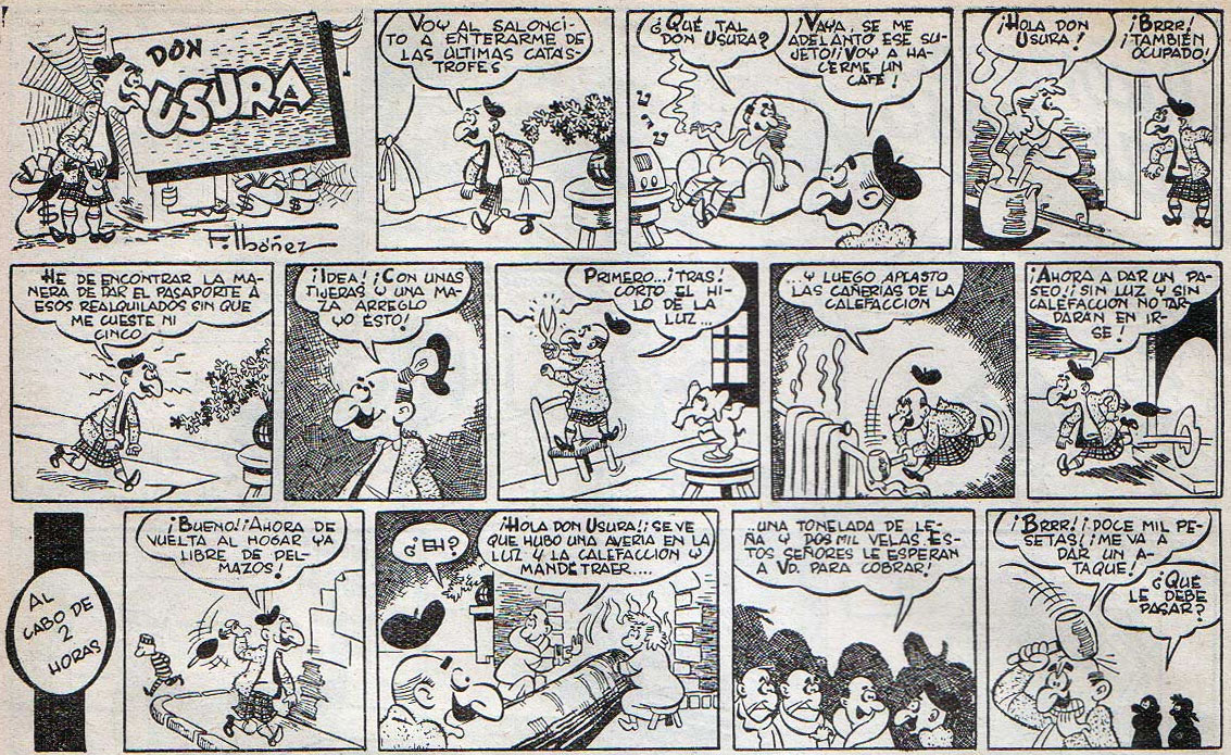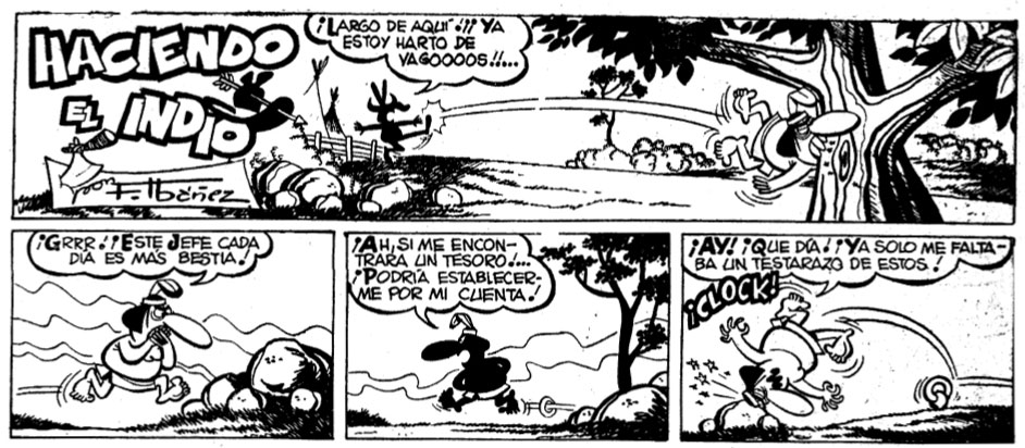 However, in Franco's Spain, working professionally as a cartoonist was not the most secure career choice. So after his primary education at the Guimerá schools in his hometown, Francisco Ibáñez studied accounting, banking and mercantile expertise. Between 1950 and 1957, he worked as a bellhop and then as portfolio and risk assistant with the Banco Español de Crédito. However, he continued to present his cartoons and comic strips to Barcelona publishing houses. At age sixteen, still during his bellhop years, he sold his first humor comic strips to Nicolás, a comic magazine published by Ediciones Cliper. In late 1952, Ibáñez filled two full pages with strips and cartoons starring characters like 'Don Pepe' and 'Don Rufo y Peporro' in the 'Almanaque para 1953' annual of Chicolino magazine, published by Símbolo. In the following year, he also had several strips printed in the 1954 annual of Símbolo's Picolin magazine. By 1953, Ibáñez had joined Josep Toutain's team at the Histograf agency, which syndicated humor comics to newspapers and magazines. Ibáñez contributed a short-lived gag strip starring a zany Native American, 'Haciendo el Indio' (1953), followed by features such as 'El Empleíto' (1953) and 'D. Doroteo y Familia' (1954-1955), appearing in magazines like La Risa and the A Todo Color supplement of newspaper La Prensa.
