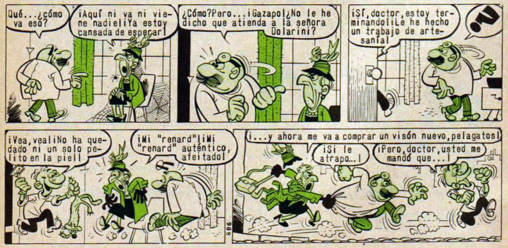 Over the course of the 1960s, Francisco Ibàñez created several shorter-lived features, before focusing fully on his main series. Several of them had the trademark Ibàñez theme: incompetent duos of which one acts despotic and tyrannical towards the other. For Tío Vivo, he made four episodes of 'Doña Pura y doña Pera, vecinas de la escalera' ("Mrs. Pura and Mrs. Pera, staircase neighbors", 1964). The first is a generous and kind-hearted old woman, who inadvertently causes problems for her neighbor, a gossipy, selfish woman with a choleric temperament. Also in 1964, he created 'El doctor Esparadrapo y su ayudante Gazapo' ("Doctor Esparadrapo and his assistant Gazapo", 1964-1965), a rather sloppy doctor without any specific specialty who receives patients from high society. Equally inept is his assistant Gazapo, a cross-eyed and bewildered man who likes to practice his medical knowledge with the office cat. After a first 1964 short story in Tío Vivo, the series was briefly revived in Pulgarcito in the following year.