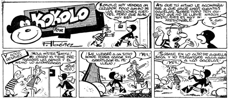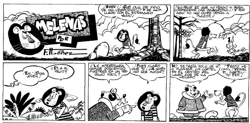 Besides La Risa, Ibáñez and his characters also appeared in other Marco titles, like Rin-tin-tin and Hipo, Monito y Fifí. In the latter, he gave life to 'El León Melenas' (1954-1958), a jungle lion dressed in pants and a striped shirt. The character returned in the early 1960s in the pages of La Risa. Other new creations for Hipo, Monito y Fifí were 'Dreson' (1955), 'El Mosquito Pérez' (1954), 'Demetrio, el Gendarme' (1955), 'Fulcio Batracio' (1956), 'Puko' (1956), 'Orejón' (1956) and 'Mike Gorilo' (1959), several of them funny animal features. Since the rights belonged to the publisher, later episodes of 'Kokolo', 'Melenas' and 'Haciendo el Indio' were made by other Marco cartoonists, such as Javier Pont, A. Pueyo, Kito, J. Cebrián and Mas Esparch.