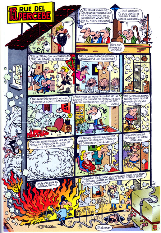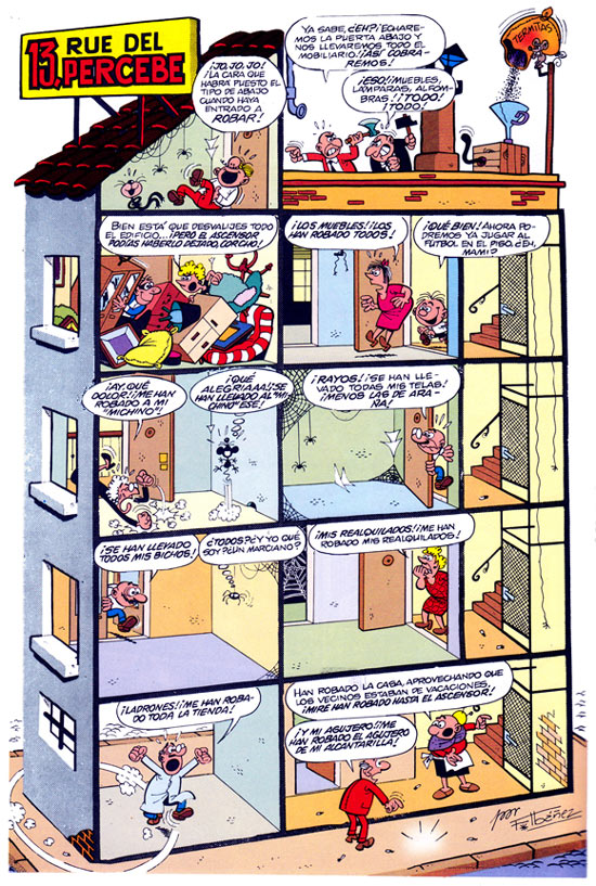 Ibáñez' crazy community consists of fixed characters with defined personalities: a defaulter, a thief, some very naughty children, a stingy landlady, an old lady who protects animals, a creator of monsters, an inventor, a scamming shopkeeper, a man who lives in a sewer and a janitor, as well as a cat and mouse who don't get along. Censors under Franco's ultra-conservative, Catholic regime objected to the monster maker character, since "only God can create life." Therefore the character was forcibly replaced by an incompetent tailor. Ibáñez drew 341 installments of the feature until 1968. It was then taken over by Juan Bernet Toledano -  who, in late 1967, had already done seven fill-in episodes. Toledano created 57 additional episodes until 26 January 1970. Until Tío Vivo's cancellation in 1981, '13, Rue del Percebe' then continued as reprints.
