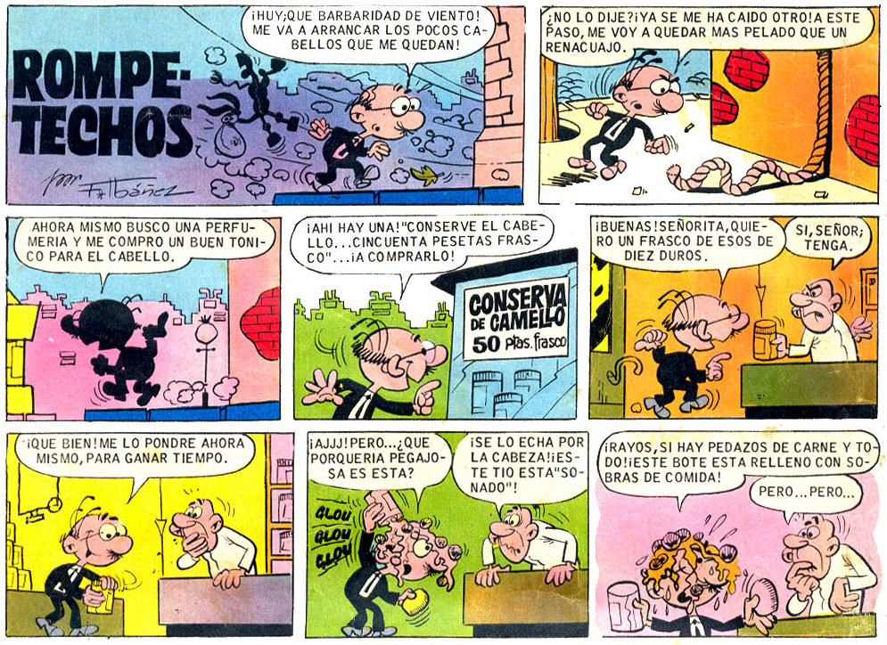 Most of Ibáñez's comics are about characters who are disastrous at their jobs, causing mayhem wherever they go. Some of his creations, however, just have bad luck in general. They are often the average man in the street, estranged from his surroundings, falling victim to whatever goes on around them. In Pulgarcito and Can Can, Ibáñez first showed his talent for self-mockery with 'Yo' (1969), a short-lived gag strip in which the cartoonist himself ends up in surreal situations because of his baldness or lack of vision. These autobiographical traits also formed the basis for his next creation, 'Rompetechos' (1964-1978, 2003-2009), a short and myopic man whose poor vision causes comical situations. This sometimes leads to absurd or meta comedy. In a special late 1960s issue of Din Dan magazine, for instance, Rompetechos sneaks into the comics of other characters, because he couldn't find his own page.