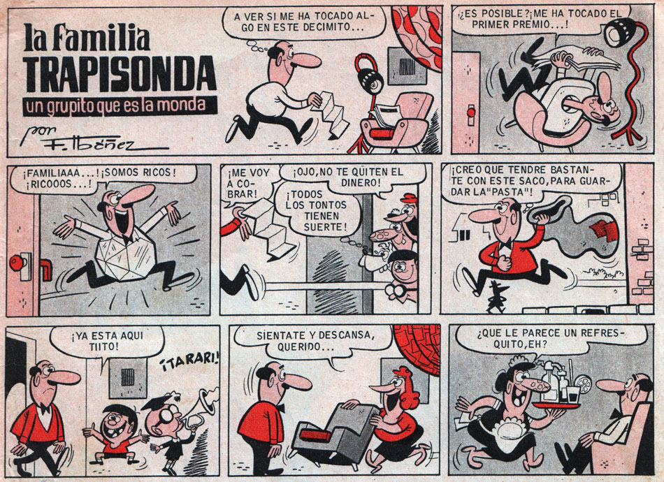 Between 1958 and 1966, Ibáñez created a great many additional comic series for the Bruguera magazines. Some lasted only a handful of episodes, like 'Felisa y Colás' in Pulgarcito (1958), three medieval-themed gags with 'El Escudero Bartolo' for the summer issues of El Capitán Trueno Extra (1960-1962) and the Far West humor strip 'Cabeza de Ajo, El Penúltimo Navajo' in El DDT (1962). Others had more longevity. Over a period of ten years, his gag page feature 'La Familia Trapisonda, un Grupito Que es La Monda' ("The Brawl Family", 1958-1968) ran in Pulgarcito (1958), Ven y Ven (1959), Selecciones de Humor de El DDT (1959), El Capitán Trueno Extra (1960-1968) and Bravo (1968). Initially, the series satirized family life, starring a married couple and their two children, the naughty Flipin and the nerdy Sabihondin. Observing the events is the family dog Atila, who has nothing but contempt for his owner. However, Spanish law at the time prohibited ridicule of parental authority and the sanctity of the family. So after about a year, Ibàñez had to transform the parents Pacracio and Lucrecia into siblings and the children into their nephews. Editorial Bruguera released several book collections with the gags, and continued to reprint the gags in magazines for years to come.