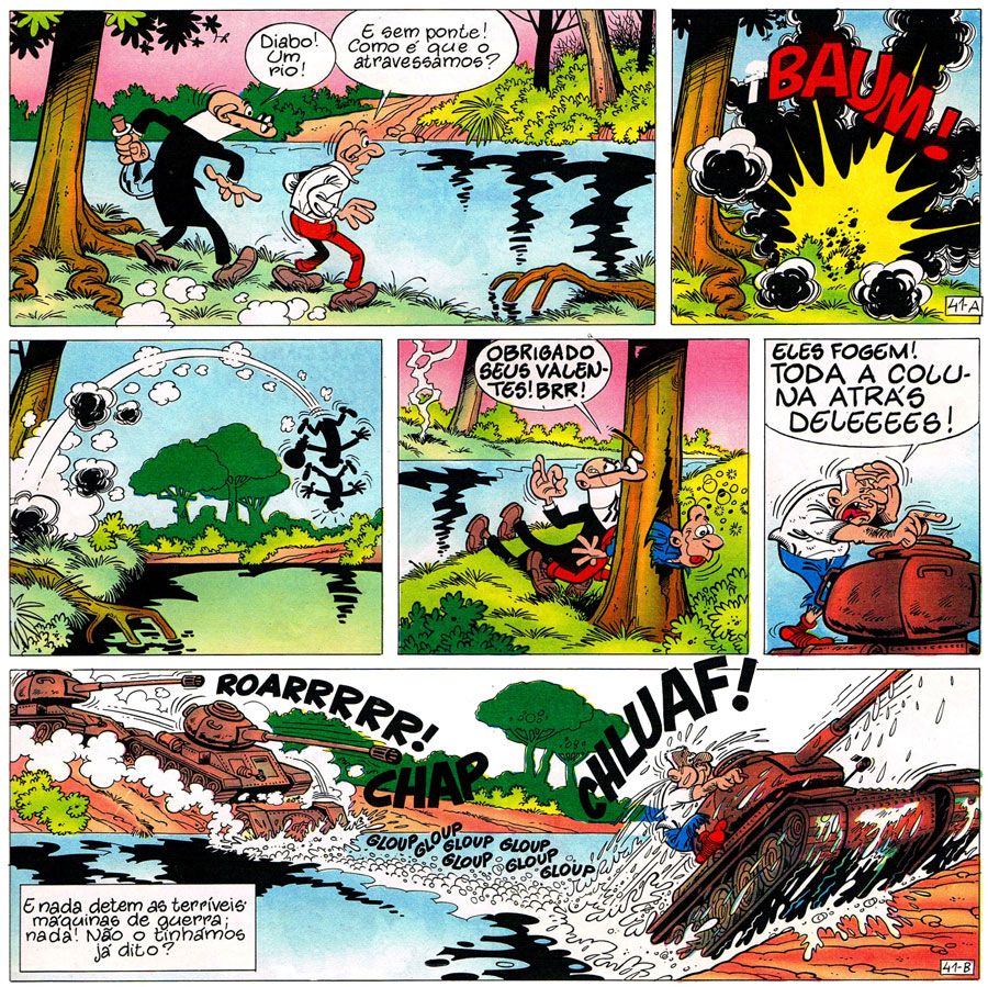 To modern-day readers, it would seem easy to dismiss Ibáñez as a mere copycat. But the situation in 1960s Spain was different than now. At Bruguera, artists had to come up with twenty pages a week to fill all the magazines. As a result, the original Bruguera house style was basic, efficient and aimed at direct comedy. During the 1960s, the editors wanted to model their magazines after the successful European comic magazines, especially the Franco-Belgian ones, and urged their artists to work in a more elaborate style. As the quantity of the work stayed the same, taking direct inspiration from foreign comics would seem the most logical thing to do, if one has to keep the same production level. On top of that, comics like 'Gaston Lagaffe' were not available in Spain at the time, and comic books were generally considered disposable items of entertainment, with no collectable value. Things turned out differently, and to this day fans and historians are studying the 'Mortadelo y Filemón' books in search of borrowed scenes.