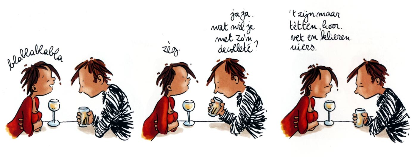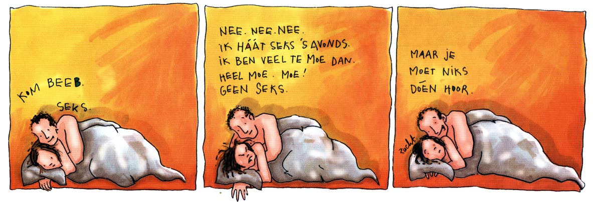 A discussion about Ilah's cartoons wouldn't be complete without delving into sex. When she debuted in the 1990s, this wasn't a common topic in most mainstream Flemish comics. Her characters often appear in the nude or are seen before, during or after sex. She also addressed an even bigger taboo: masturbation. Cordelia and Mira sometimes enjoy their vibrator or sex toys. The direct depiction of sex attracted quite some attention, parcticularly since these cartoons were made by a woman. However, to Ilah sex is just one of many aspects of life. In interviews, she explained that it would feel odd to her not to discuss it, nor find some comedy in it. Overall, the topic is presented so matter-of-fact that nobody objects to it at all. The nudity is handled tastefully, without overly eroticizing her characters.