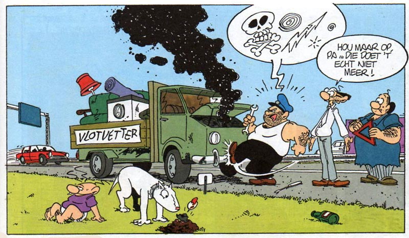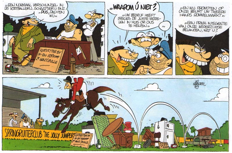 Leo Immerzeel is a comic artist and illustrator from Schiedam, who received his education at the Art Academy in Rotterdam. He published his early work in De Vrije Balloen and house organs of companies like Fiat and Texaco. In 1988, he launched his comic feature 'Vlotvetter en Van Krampen' in Aktueel. Three albums of this series were published by De Vrijbuiter. After three and a half years of 'Vlotvetter', Immerzeel began the satirical sports comic 'Sportshots'. In the second half of the 1980s he also ghosted Willem Ritstier's newspaper strip 'Bartje' for the newspapers of the Sijthoff Press Group (Rotterdams Nieuwsblad, Haagsche Courant, Goudsche Courant).
