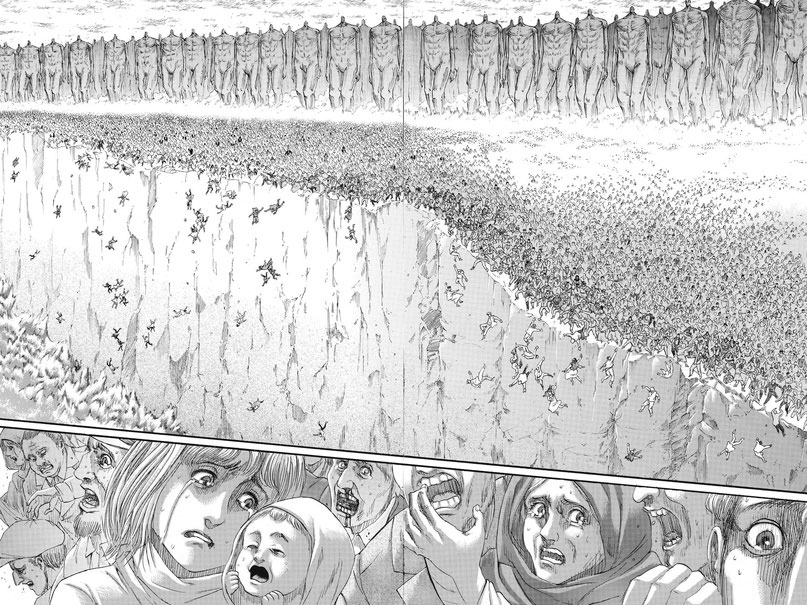 In September 2009, 'Attack on Titan' began serialization in Bessatsu Shonen's first issue. The story is set in a post-apocalyptic period, when humanity was almost wiped out by the attack of the Titans. Nobody knows where these gluttonous giants came from, but they terrorized Earth to such a degree that a surviving people, the Eldians, built three protective walls around their city. The local military force, the Survey Corps, developed steel swords, a gas-powered engine and grappling hooks that people can use to leap at the giants, trying to pull them out of balance. They receive the name Vertical Maneuvering Equipment. Later the army also invents a special rocket launcher, the Thunder Spear. Luckily, the city hasn't seen any Titans in the past century. But one unfateful day, an unprecedentedly 60 meter tall Titan, called the Colossal Titan, finds the city and manages to break through the first wall, allowing dozens of Titans to stream inside. Hundreds of citizens are eaten alive. A young boy, Eren Yeager, witnesses his mother being devoured by a Titan with an eerie smile. He survives, but swears revenge. Together with two friends, the boy Armin Arlert and girl Mikasa Ackerman, he enlists in the Survey Corps, learning all the necessary skills to fend off a possible new attack.