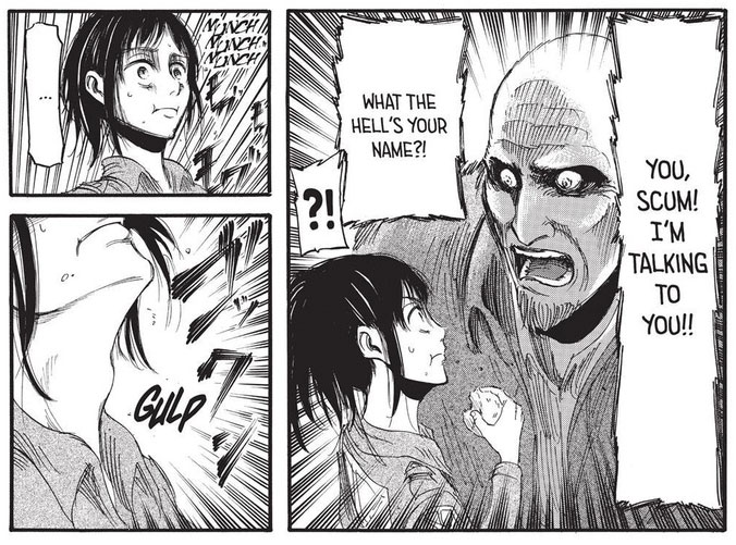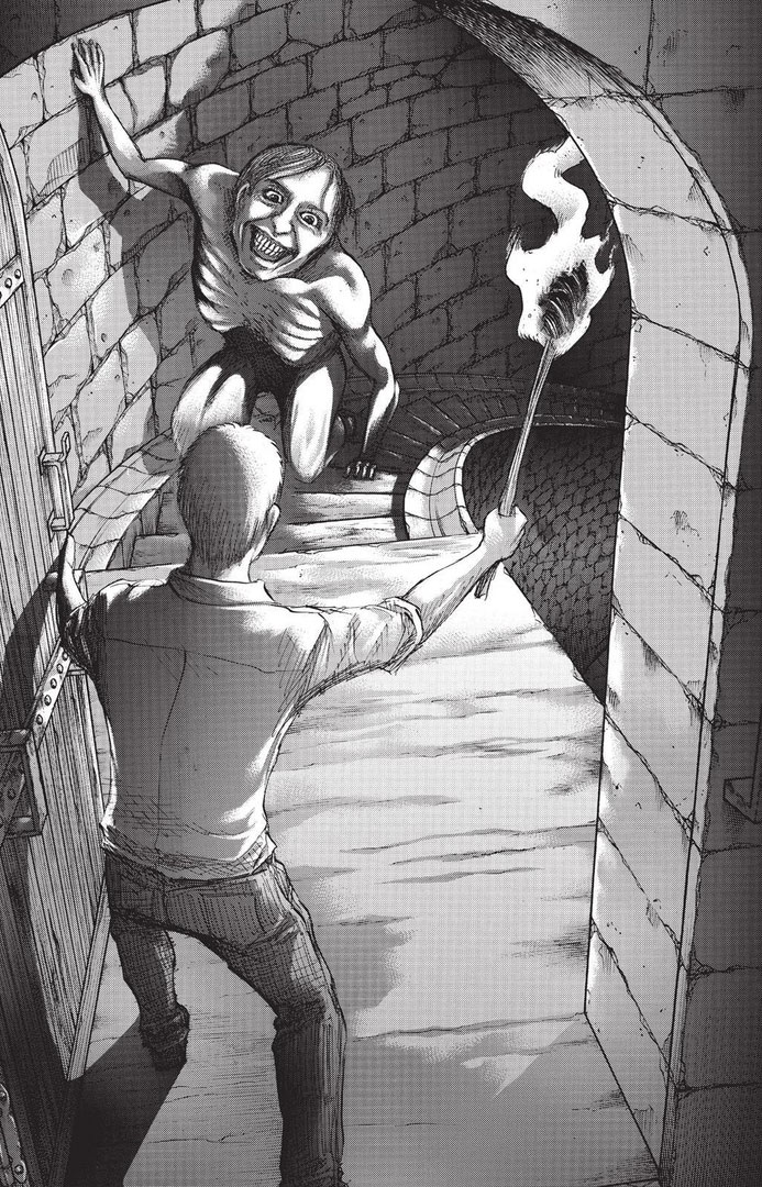 Many of the giants in 'Attack on Titan' have grotesque faces and bodies. One titan is chubby and has a head almost too big for its body. Others have a rictus grin, comparable to the eerie smile of a skull. Some giants have decomposed faces or skinned torsos and limbs. The Beast Titan looks like a huge orangutan. Isayama designed him like an ape, because "monkeys are just scary (...) precisely because they're so similar to humans." The posture of The Beast Titan was based on Alistair Overeem, a mixed martial artist with a small face and developed trapezius that gave him an "intimidating physique." Similarly, Isayama based Eren's Titan body on UFC fighter Yushin Okami and the Armored Titan on wrestler Brock Lesnar. Isayama always enjoyed drawing ugly things as a kid, which became one of his trademarks by the time he reached young adulthood. He is also interested in actors with "memorable faces" in movies, rather than the attractive people in the leading roles. Interviewed by Daisuke Okamoto for volume 42 of Febri (June 2017), Isayama recalled that when he drew the scene in the 10th volume when a Titan surprises one of his characters on the stairs, he actually felt frightened and disturbed by his own artwork.