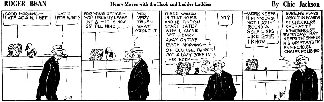 Chic Jackson was an early 20th-century U.S. newspaper cartoonist, most famous for his signature series 'Roger Bean' (1913-1934). It was one of the earliest comics to revolve around a family. All episodes followed a continuity in which the characters also aged throughout the years. In this sense, 'Roger Bean' was the first soap opera in the comic world. It paved the way for several other comic series with ageing characters. From the 1910s until the early 1930s, 'Roger Bean' was nationally syndicated and very beloved with U.S. readers. However, Jackson's early death meant the abrupt end of his hit series. Since then, both him and his populair comic strip have unfortunately faded away in obscurity.
