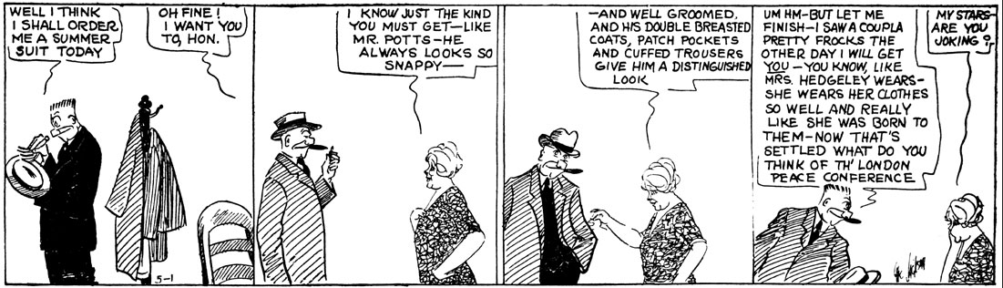 While 'Roger Bean' wasn't the first family comic in history, it was the first to actually catch on nationwide and run for many decades with the same success comparable to a modern-day TV sitcom or a soap. It also marked the start of an evolution in newspaper comics. Before, most 19th-century and early-20th century comics relied heavily on formulaic slapstick, with people getting fooled or hurt as the main punchline. 'Roger Bean' didn't shy away from such jokes either, but nevertheless focused more on verbal comedy, much like a vaudeville theater sketch. 'Roger Bean' was one of the earliest newspaper comics to evolve to more sophisticated comedy. The series had its own set of running gags, again much like a present-day sitcom. Roger Bean would complain about not being served breakfast, his next-door neighbor would criticize him, Golduh Stubbins would say something outrageous,... Jackson saw humor in common, everyday events. His own family and neighborhood gave him a never-ending supply of ideas. For instance: the Beans lived at 3029 Denver Road in Indianapolis, which happened to be his own house number on Broadway. As the decades passed by, other humorous newspaper comics would follow his example.