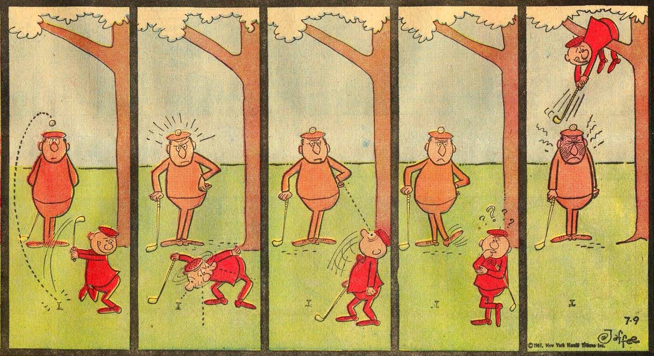 Another famous comic strip by Al Jaffee is the less regular appearing 'Snappy Answers to Stupid Questions', which debuted in issue #98 (October 1965). It features characters asking questions where the answers are already obvious. Instead of giving them a straight answer, other characters come up with three different sarcastic, unusual and witty replies per question. It has been suggested that Jaffee might have been inspired by Rube Goldberg's 'Foolish Questions' gag cartoon, but Jaffee has stated he never saw it until years later. Instead he got the idea when he was working in his house and his son kept asking where "mummy" was. Jaffee usually didn't know, so he just invented crazy explanations to annoy his son. Readers loved the feature, especially young teenagers who like giving sarcastic replies to everybody. As Jaffee went through a divorce in the late 1960s, the 'Snappy Answers' series provided him with the perfect outlet for his frustrations. Over the years, he made countless new episodes using different settings. A steady stream of paperback collections made it his most generally available work.