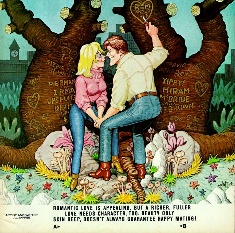 In 1952, Jaffee's high school mate Harvey Kurtzman founded a revolutionary satirical comic magazine: Mad. The stories were full of biting, but funny parodies of comics, films, novels, TV shows and advertisements. Compared with the quaint work he penciled before, Jaffee liked Mad much better. He applied for a job and was easily accepted, due to his connections with Kurtzman. Jaffee debuted in the 25th issue (September 1955), mostly writing articles and comics illustrated by Jack Davis. In 1956, Kurtzman left Mad over creative differences and founded other satirical magazines, like Trump (1957) and Humbug (1957-1958). Jaffee initially joined Kurtzman, but as these publications went defunct he quickly returned to his former employer. The experience wasn't a waste of time, though, as Jaffee had the opportunity to use the material he published in Trump and Humbug for his resumé. Jaffee returned to Mad from its 43th issue (December 1956) on and stayed with the magazine for more than half a century. In the early days Jaffee was predominantly a comic writer. It wasn't until 1964, when he came up with his iconic Fold-In that he started illustrating more.