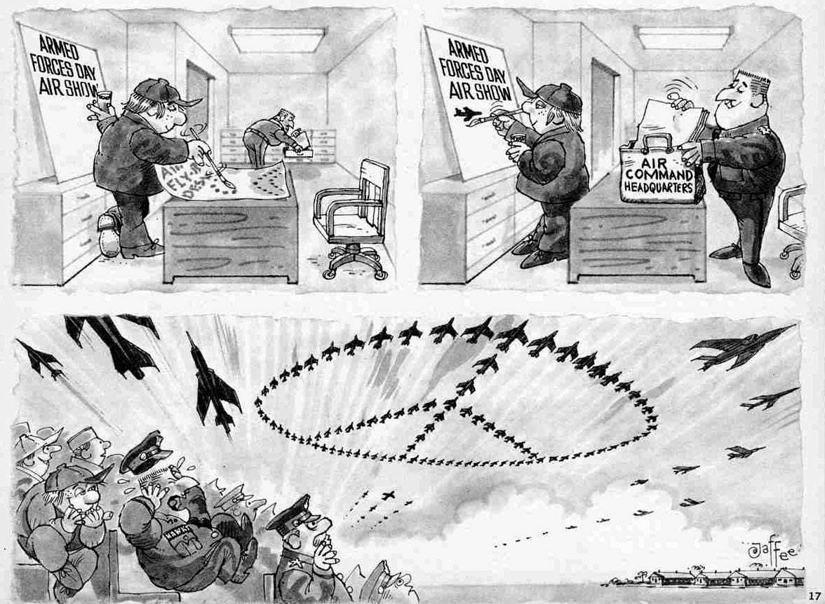 Jaffee created one short-lived gag cartoon series for Mad, 'Hawks & Doves' (1970-1972), which only ran from issue #137 (September 1970) to #148 (January 1972). The gags deal with a strict military officer, Major Hawks and his subordinate Private Doves. To Hawks' anger, Doves creates peace signs all over the military base. The one-page gags were done in pantomime and usually appeared on the back cover, so they could be printed in color.