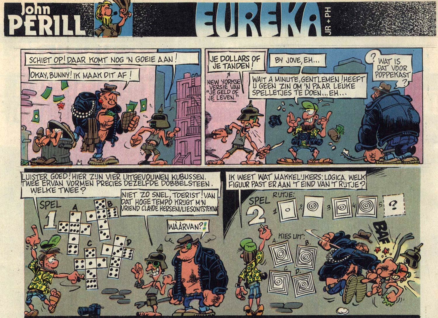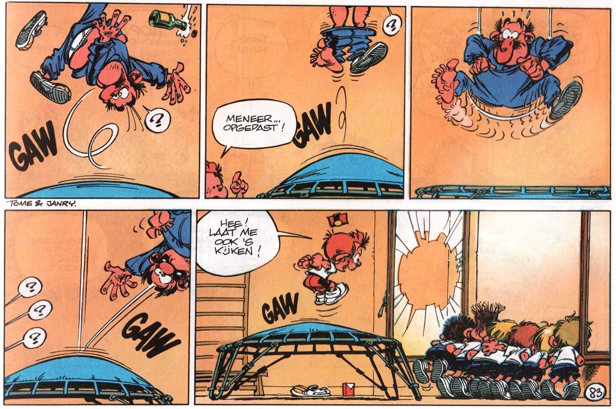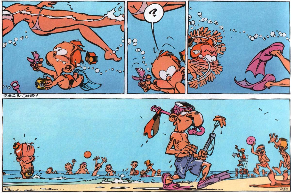 A career-defining moment for both Jean-Richard Geurts and Philippe Vandevelde happened in 1979, when they delivered Dupa's contribution to a collective anniversary story of Jean Roba's 'Boule et Bill' comic to the editorial offices of Spirou magazine. While they were there, they showed their own work to chief editor Alain De Kuyssche, who liked it so much that he offered them the opportunity to work for his magazine. In November 1980 the duo launched a weekly puzzle comic in Spirou's back pages, titled 'Jeurêka', which ran in the magazine until late 1981. It starred the explorer/detective John Perill. By then the artists had not yet settled on their "joint" pen names, and the feature was simply credited to "JR+PH". The mix of gag comic and puzzle feature was an early showcase of the author's humor and inventiveness. They arrived around the same time as another legendary duo, Yann and Conrad, who provided satirical and often controversial illustrations in the headers of Spirou's pages. While the latter two caused a revolution within the pages of the Catholic children's magazine, Tome and Janry had the most lasting impact and heralded in Spirou's modern age.
