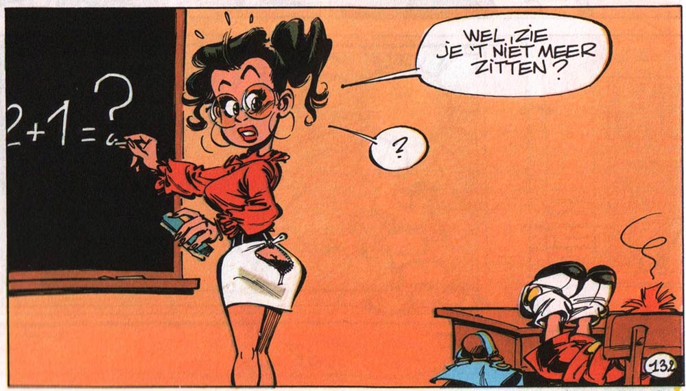 'Le Petit Spirou' features no characters from the main series, except Spirou himself. Some hints at his later-day adventures are given in some of the early gags, but these references were dropped when the series proved to be a mainstay and could continue on its own. Young Spirou lives with his parents and his grandfather, who are all dressed in the well-known bellboy uniforms. His main partners in crime are his best friend Antoine Vertignasse, the gluttonous Nicolas Ponchelot and his love interest Suzette. He is also very close to his grandfather, a World War I veteran with an equally playful and frivolous nature. Many gags are filled with sexual innuendo, especially when Spirou and their friends are peeping at their sexy math teacher, Miss Claudia Chiffre. The main victims of their escapades are Mr. Mégot, the drinking and smoking gym teacher, and father Angelusse, the town's devout abbot. 'Le Petit Spirou' has an odd anachronistic atmosphere. Some elements are definitely old-fashioned, like the town abbot (complete with out-of-date costume) and Spirou's grandfather's World War I past. Yet for the most part the series is set in our modern age, with references to television, cell phones and video games. The first album was published by Dupuis in 1990, and each album traditionally starts off with a five-page story, followed by a series of gags.
