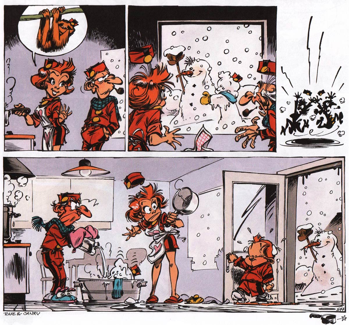 To keep up with their workload, Tome and Janry have received assistance from several co-workers over the years. The first of them was their old friend Stéphane De Becker, who became the colorist for all the duo's projects, starting with the 'Spirou' episode 'Le Réveil du Z' (1985), until his unfortunate death in 2015. With the launch of 'Le Petit Spirou', young artists were attracted to help drawing with the weekly gag page. The three friends set up shop in Tome's apartment in Woluwé-Saint-Lambert, where they were first joined by Bruno Gazzotti (in 1988), and then by Dan Verlinden (since 1993). Young artists like Eric ClosterYves UrbainAdam and Ralph Meyer have also worked at Tome and Janry's atelier. With their own background as assistants in mind, Tome and Janry felt they should credit both Gazzotti and Verlinden for their contributions. When Verlinden has done the most work on a 'Petit Spirou' gag, his name is even mentioned first at the bottom of the page. The authors also support their assistants in doing their own projects.